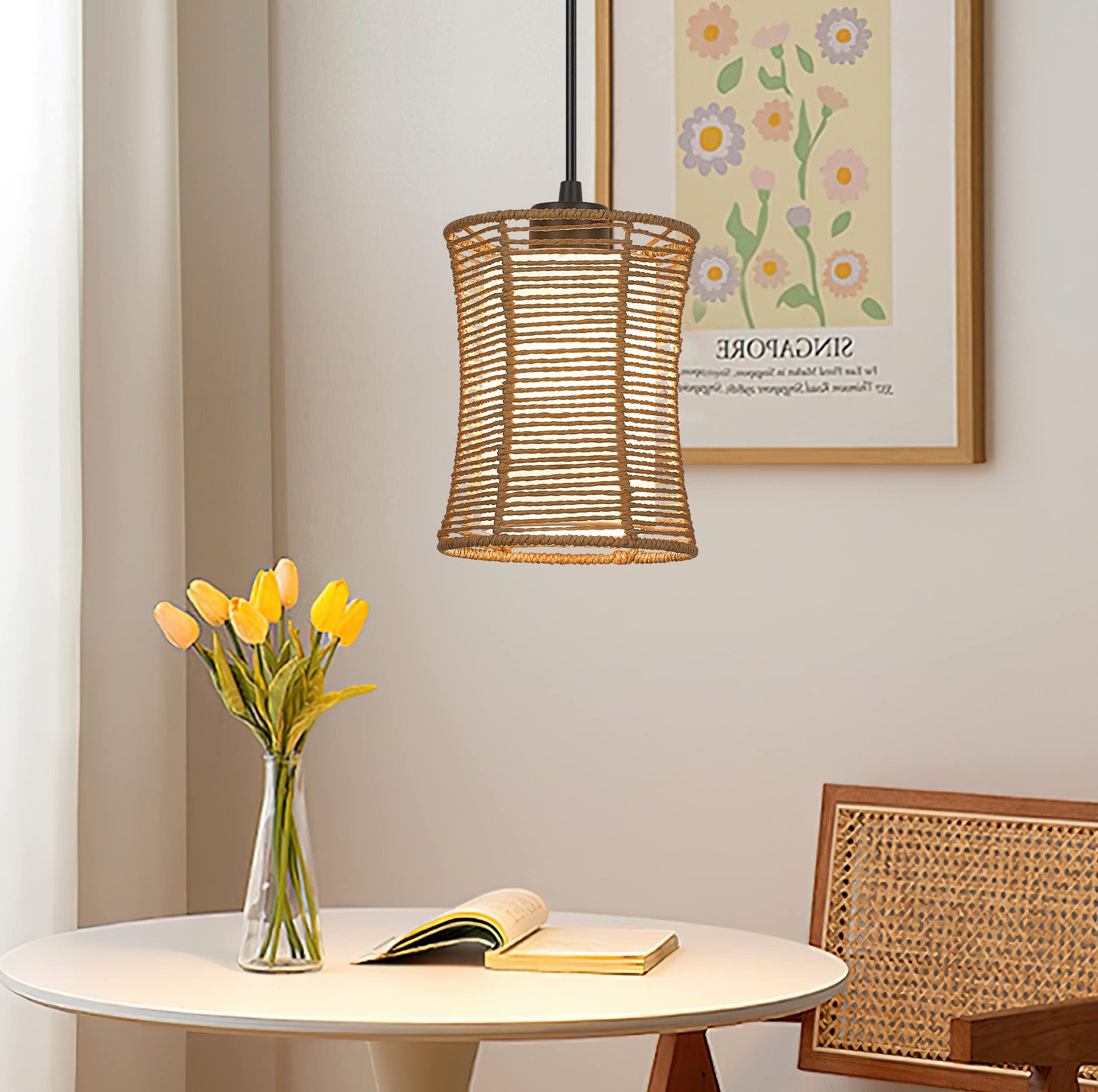 Emak Modern 6 Inch Woven Pendant Lights, Farmhouse Pendant Light With Fabric And Rattan Shade, 1 Light Hanging Lights For Bedroom, Kitchen Island, Bar, Dining Room, Bathroom, PL117-NL Rattan - Natural