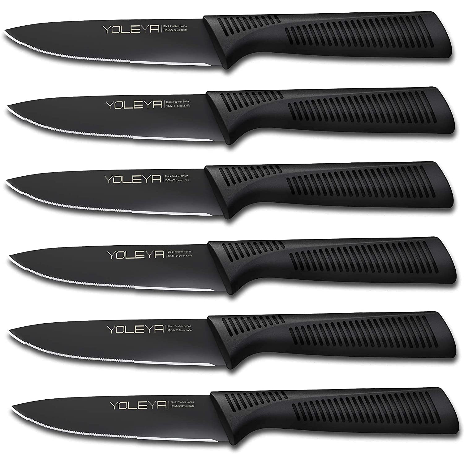 6-Pieces Set: YOLEYA High Carbon German Stainless Steel Black Serrated Steak Knife Set