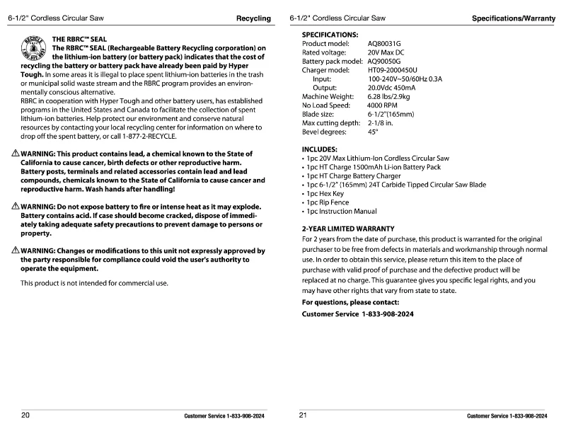 The Hyper Tough 20V Max Lithium-ion Cordless 6-1/2 inch Circular Saw with 1.5Ah Lithium-ion Battery, Charger, Blade & Rip Fence makes a great addition to any workshop. This lightweight but powerful saw and cordless convenience delivers a no load speed of 4000 RPMs for fast accurate one handed cutting and can be used where AC power is not closely available. The saw is well balanced with an ergonomically designed handle for effortless cutting and control along with blade guard. The adjustable base allows cutting depth control up to 2-1/8 inches at 90 degrees as well as bevel cuts up to 45 degrees. The left side mounted blade also give the user a better sight line for straighter cuts. The saw is great for home improvement jobs comes complete with 1, 6.5 inch, 24 tooth blade for most universal cutting in wood plastic or laminate. The adjustable bevel allows for cutting angles from 0-45 degrees. The tool also comes with an adjustable parallel guide which can be attached to the saw for those long straight cuts. The tool includes 1 battery and 1, battery charger.