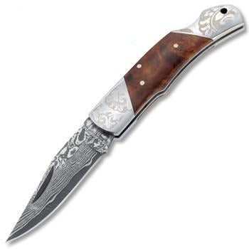 This luxurious knife is sure to dazzle! It hosts a 2 1/2" Damascus blade knife with detailed bolsters offering an attractive contrast to the handpicked burl wood scales, providing an ergonomic feel when held. Despite its sophisticated appearance, this is a dependable and hardworking knife, offering a backlock mechanism and lanyard hole to make it your go-to everyday blade.