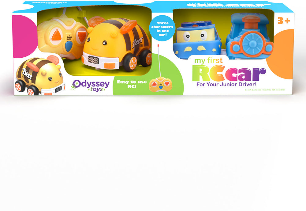 What's that buzz? We'll tell you what's a-happenin': the perfect first remote control car for ages 3+ has arrived! This clever RC vehicle has easily interchangeable character car covers: Buzzing Bee, Choo Choo Train, and Cruisey Ship. The remote control has simple forward and backward buttons and is easy for little hands to hold and use. Great for learning cause and effect and perfect for kids who love cars! Requires 5 AA batteries, not included.