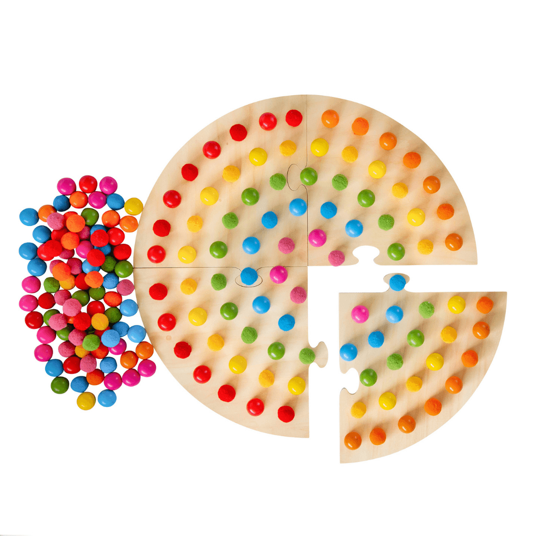 My Rainbow Globe features beautiful bright colours and so many learning opportunities all rolled into one fantastic toy. A puzzle and sorting toy combined, children can use their creativity to sort colours, or design patterns filling up the puzzle with their favourite coloured wooden or felt balls, both of which are included in this set. This one is the perfect aid for recognising colours and developing those fine motor skills. As children become more confident the Rainbow globe can be used to engage children to develop early math skills such as practice counting, pattern making, fractions and other basic mathematical concepts. The set includes 90 wooden balls, 90 felt balls and 4 large wooden puzzle piece bases.